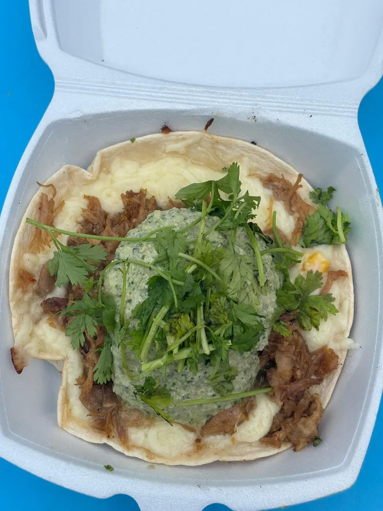 Enjoy the flavors of La Llorona Served with a warm flour tortilla with crumbled cheese, shredded pork, cliantro, and slow roasted red pepper salsa.